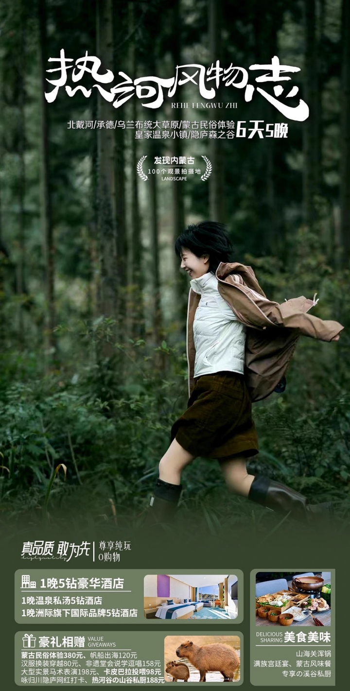 亮點:【草原部落民俗】【網(wǎng)紅景點·熱河谷】【山谷阿媽】【溫泉小鎮(zhèn)】 08:00【草原部落民俗娛樂活動】(380元/人,費用已含)走進(jìn)蒙古部落探秘,草原民俗活動。觀賞壯觀的實 景馬術(shù)表演,體驗各類娛樂項目:品額吉奶茶、那達(dá)慕摔跤表演、祭祀敖包、民族服裝拍照、彩虹滑草、 拔河比賽,祭祀百草敖包;木蘭秋狝狩獵射箭(10支);民族服裝拍照;蒙語小課堂,搭建蒙古包等。 后前往土特產(chǎn)超市,免費品嘗土特產(chǎn)品。 11:30 中餐自理 13:00【熱河谷】很少有一片土地能像熱河這樣,涵蓋著森林、高山、草原、農(nóng)田,水源等如此豐富的生態(tài)序列一望無際的油松、落葉松林區(qū),與大片的白樺林和紅楓,一同構(gòu)成了最美的塞外風(fēng)光。 ·熱河谷,讓你的天真繼續(xù)有野可歸。在這里,你可以烹一盞清茶,傾聽正潺潺流過的小溪,與山野朝夕相伴,與自由心靈遠(yuǎn)足。在城市之外,體驗另一種生活,讓心回歸自然鄉(xiāng)野。 17:00 特色美食·專享の溪谷私廚 18:00晚入住【金水灣溫泉度假酒店】坐落在距今己有2000多年悠久歷史的溫泉遺址之上長此以往被名曰:七家神泉。這里被譽為-中國最美森林溫泉。金水灣溫泉據(jù)史料記載,燕國太子曾多次到此神泉療養(yǎng)健身;唐代幾次征討契丹時,七家神泉曾是戰(zhàn)將傷兵洗浴療傷之地。 |