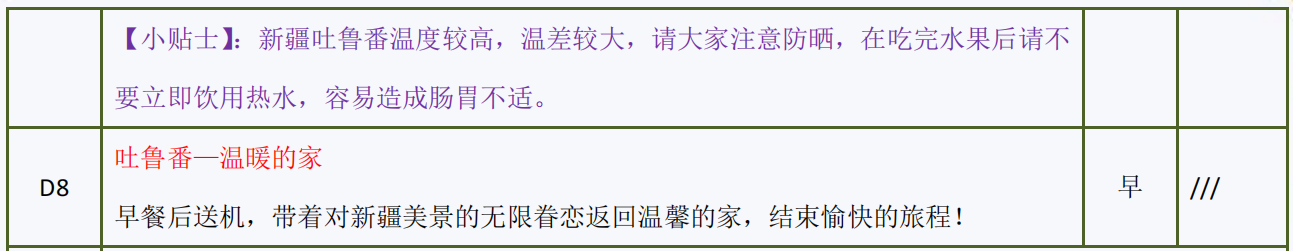 備注:旅程沿線受地域限制餐飲質(zhì)量有限且個別餐為路餐特色抓飯或拌面,一人一份。請游客提前做好心理準(zhǔn)備,不吃不退;另途中用餐時間難于掌握可能用餐時間會較早或較遲,請游客提前自備零食,異地旅游用餐較易引起水土不服,請自備常用藥。