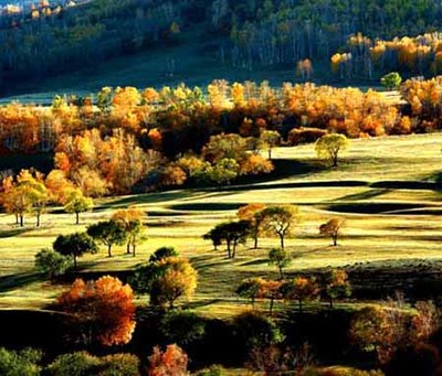 看山間的叢林也穿上了五彩的衣裳,各種樹木的葉子,有的金黃,有的火紅,有的依然翠綠,特別是白樺樹的葉子,油潤潤、金燦燦的黃,漂亮異常。