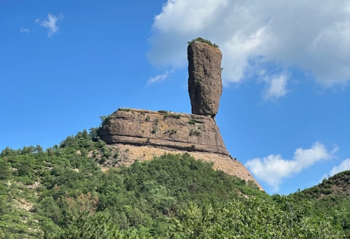 磬錘峰,古稱石挺,俗稱棒槌山。早在1400多年前,北魏著名地理學(xué)家酈道元在《水經(jīng)注》中就有記載,稱其“孤石云舉,臨崖危峻,可高百余仞”。經(jīng)實(shí)際測量,磬錘峰海拔596.29米,槌高38.29米,連同基座高59.42米,上部直徑15.04米,下部直徑10.7米,體積約為6508立方米,重約16205噸,估計已有300萬年的高齡。峰槌半山腰有一株桑樹,高約3米,大約有300多年的樹齡。
