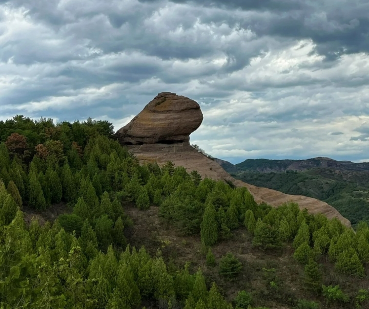 磬錘峰南500米左右的山崖邊上,一塊大石昂首凸目,躍躍欲試,遠(yuǎn)遠(yuǎn)望去,酷似一只蹲坐的大蛤蟆,這就是蛤蟆石。石蛤蟆背北面南,頭探出懸崖,大嘴微微啟動,其態(tài)十分惹人喜愛。蛤蟆石身高約14米,體長約20米,腹下有兩個空洞,兩洞南北相連,東西貫通,人可爬行而過。盛夏登游,洞內(nèi)涼風(fēng)習(xí)習(xí),清爽異常
